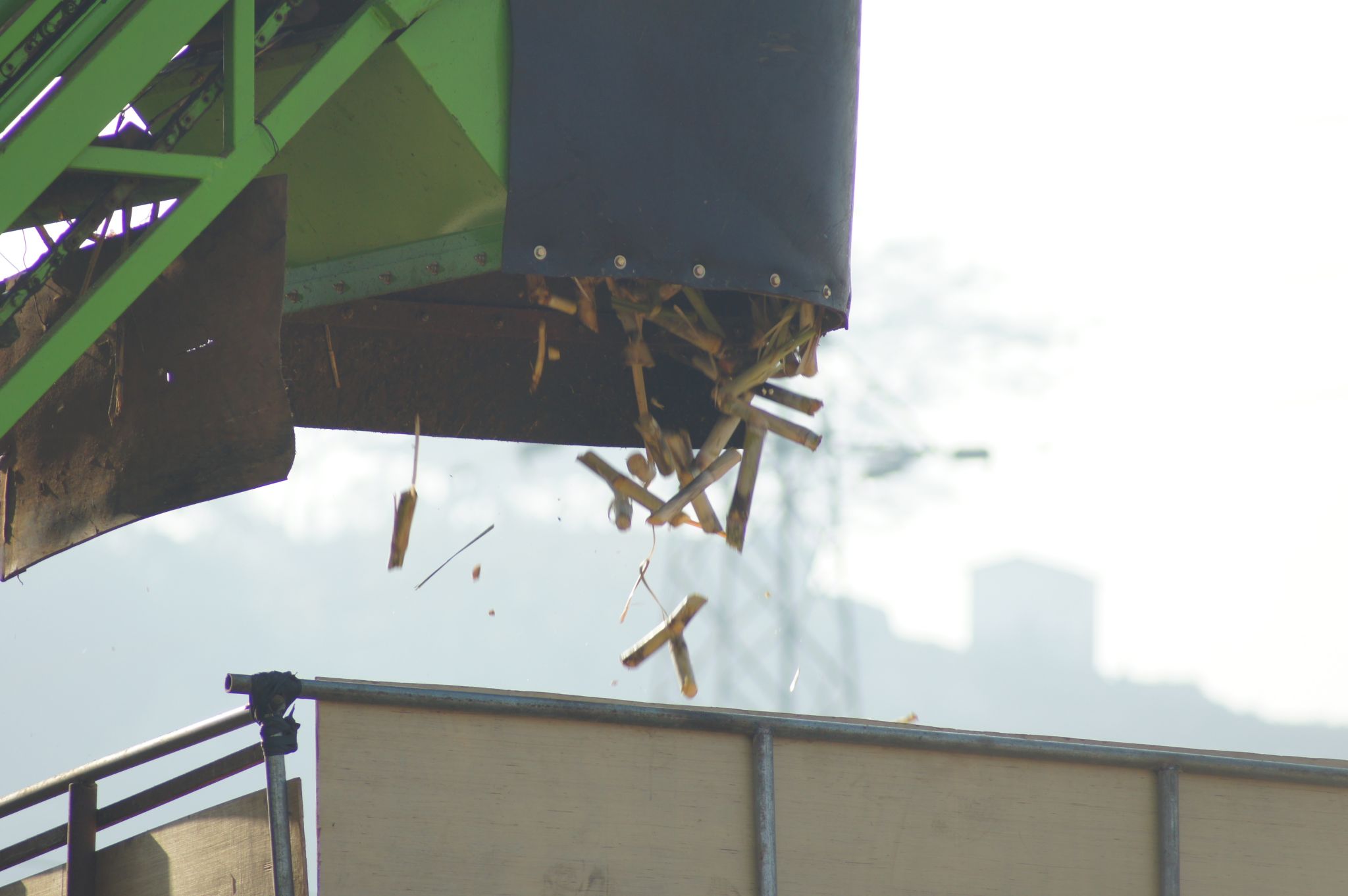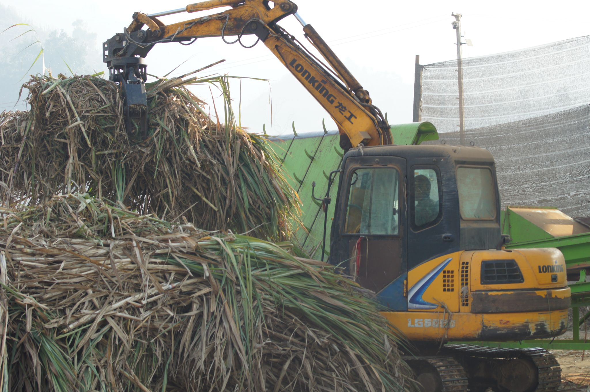工地现场,只见拉运甘蔗的大车将甘蔗倾倒在空地上,旋转抓装载机灵敏地将甘蔗放到投送平台,由传送带将甘蔗送入脱叶机内;脱叶机马力全开,将甘蔗叶“吹飞”到储叶棚里,脱完叶的甘蔗则被投送到下一个平台进行切短处理;30厘米长短的甘蔗从出口处掉落到拉运车上,最终被拉往糖厂。
