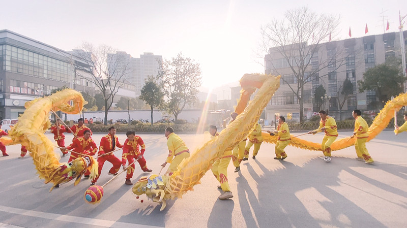 连日来,龙陵县城里,伴着铿锵有力、热闹非凡的锣鼓声,两条金色的长龙在大街上舞动起来。“星空谷”舞龙队的26名队员身穿华服,配合默契,动作娴熟地舞动着长龙。一阵热热闹闹地舞龙过后,吉祥的祝福有节奏地荡漾开来:“两条金龙进门来,恭贺主人,兔年吉祥,人安康;龙头抬一抬,恭贺主人,天天进财,四方来。”