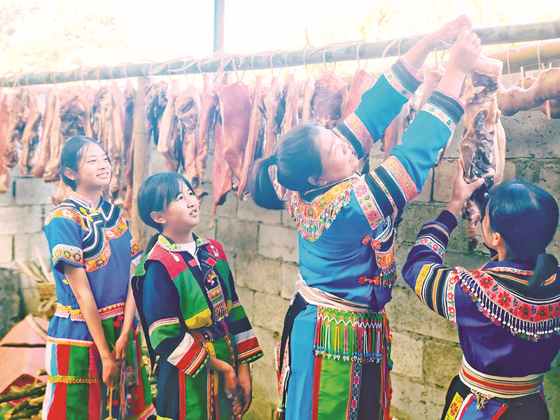 年关将至,龙陵县龙新乡黄草坝社区小米地的傈僳族阿妈余梅花带着女儿晾晒腌制好的腊肉。阵阵腊味香气,飘来年味浓浓,洋溢着少数民族群众对美好生活的祝愿。