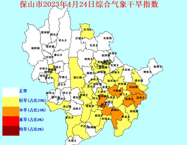 此次降水天气过程的出现,使得保山大部地区的旱情得到一定缓解或缓和,其中腾冲市大部、龙陵县北部、隆阳区西北部过程累计雨量普遍达到了10~25毫米,旱情得到明显缓解,其他区域过程雨量不足10毫米,施甸南部边缘及昌宁的中部及以南地区累计降雨量不足5毫米,该区域仍维持中等强度的气象干旱。
