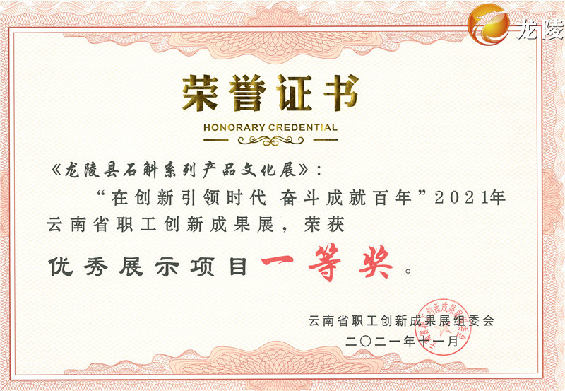 11月15日—20日在昆明国际会展中心7号馆举办的云南省职工创新成果展上,龙陵县总工会组织参展的云南品斛堂生物科技有限公司荣获“2021年云南省职工创新成果展优秀展示项目”一等奖。