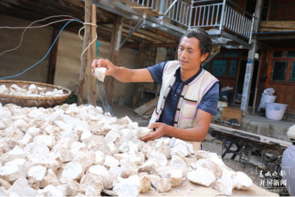 傈僳族胡连荣是黄连河村松茯苓种植户,全家五口人。他的妻子曹石英在家料理家务,按节令栽种传统农作,小日子过得还算不错。胡连荣曾经栽种松茯苓五年多,去年在朋友的带动下外出打工。打工不易,钱也没赚到。几经思考,胡连荣发现还是栽种松茯苓的收益好:不仅产量高,生长周期短,而且见效非常快,有专门的收购商以10元1公斤上门收购,于是今年他又干回老本行,种下4亩多松茯苓,目前长势正好。