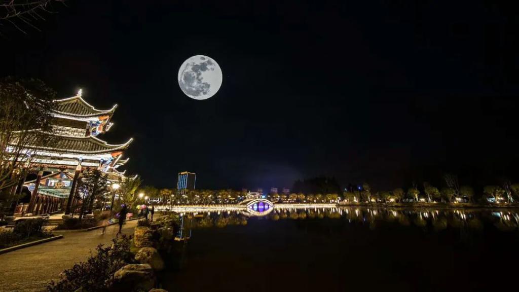 光影之湖。当最后一缕阳光消失,夜幕缓缓降临。五光十色的灯光洒在湖面上,也洒在小桥头、栈道边、花廊上、密林旁,闪烁的光柱宛若利剑出鞘,驱赶着茫茫黑夜,射出来的光斑错落有致,颇为壮观,格外吸引眼球。远远望去,灯光投影在湖水中,湖水掩映着灯光,璀璨的灯光在湖面拖出了一条条长尾巴,朦朦胧胧,辨不清哪里是水面哪里是灯光,让人徘徊在灯影阑珊处,伴着清凉的夜风,总是舍不得离开。在光影交融的龙山湖,当你体验到“湖上生明月,天涯共此时”情境之时,也会勾起“望月怀远”的心绪,这或许就是龙山湖的光影魅力所在。