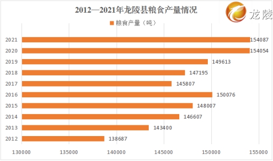 农业稳步发展。2021年,全县实现农林牧渔总产值55.43亿元,较2012年增加34.34亿元,增长1.6倍,年均增长6.8%。粮食安全更有保障,实现粮食总产量15.4万吨,较2012年的13.87万吨增加1.53万吨,年均增长2.5%。