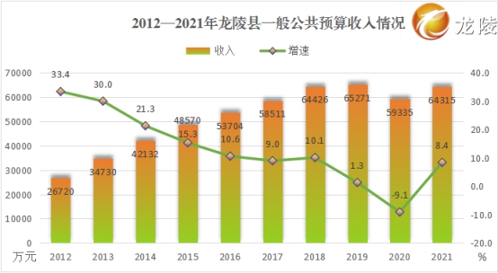 财政收入保持持续增长。2021年,全县实现地方财政总收入13.58亿元,较2012年增加8.59亿元,增长1.7倍,年均增长12.4%。其中一般公共预算收入6.43亿元,较2012年增加3.76亿元,增长1.4倍,年均增长12.4%。财政支出方面,财政总支出29.62亿元,较2012年增加12.42亿元,增长0.7倍,年均增长7.2%。其中地方一般公共财政预算支出26.53亿元,较2012年增加10.93亿元,增长0.7倍,年均增长7.7%,其中,用于公共服务、教育、医疗卫生、交通、农林水务等民生支出占财政支出的62.8%。