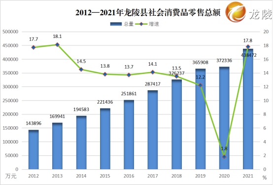 居民消费需求不断扩大。2021年,全县实现社会消费品零售总额43.85亿元,较2012年增加34.73亿元,增长3.8倍,年均增长13.3%。其中:城镇消费品零售额14.43亿元,较2012年增加10.01亿元,年均增长14.9%;农村消费品零售额29.42亿元,较2012年增加24.71亿元,年均增长21.6%。