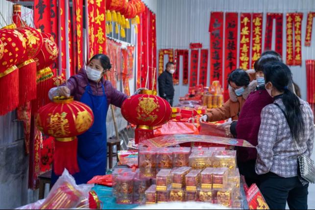 在卖春联的摊位上,许多市民正忙着挑选春联、灯笼、窗花、红包等。市民段金仙挑了一副“新春大吉”的对联,看着大气厚重的字体,她高兴地说:“希望来年‘福旺财旺运气旺,家兴人兴事业兴’,再买上一对大红灯笼挂起来,企盼未来的日子红红火火!”
