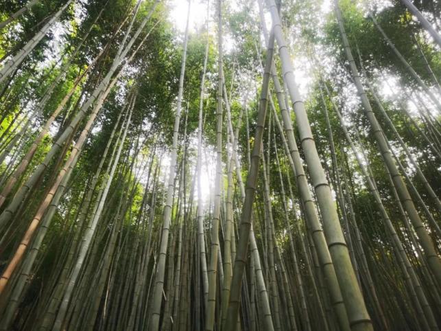 绿竹入幽径,青萝拂行衣。徘徊于竹林深处,或独坐幽篁静思,或闲步竹海赏景,阳光透过竹叶肆意洒在身上,斑驳的光影随着竹林的晃动而晃动,偶有点点绿光在闪动,好像灵动清澈的眸子,又若繁星在摇曳。时有风吹竹叶响,轻歌耳畔唱的意境和“飞花竹叶”般的烂漫,像极了影视剧里的唯美镜头。