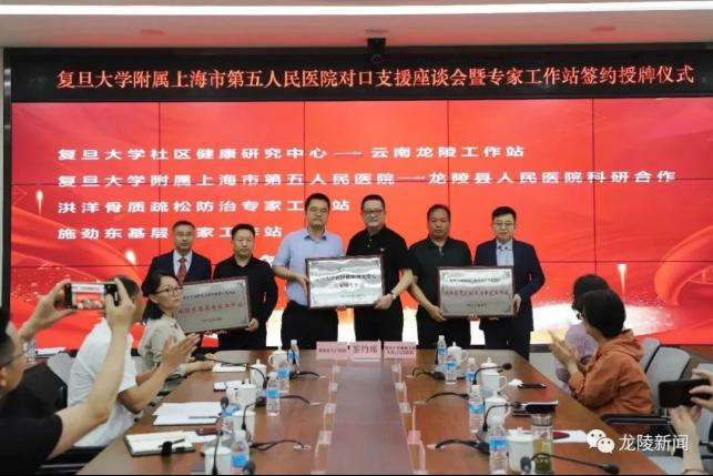 4月18日,复旦大学附属上海市第五人民医院对口支援座谈会暨专家工作站签约授牌仪式在龙陵县人民医院举行,双方分别签署了“复旦大学社区健康研究中心云南龙陵工作站”“洪洋骨质疏松防治专家工作站”“施劲东基层专家工作站”合作共建协议以及科研合作协议,并为3个工作站授牌。