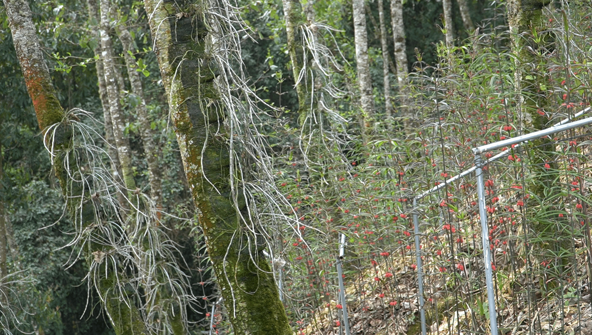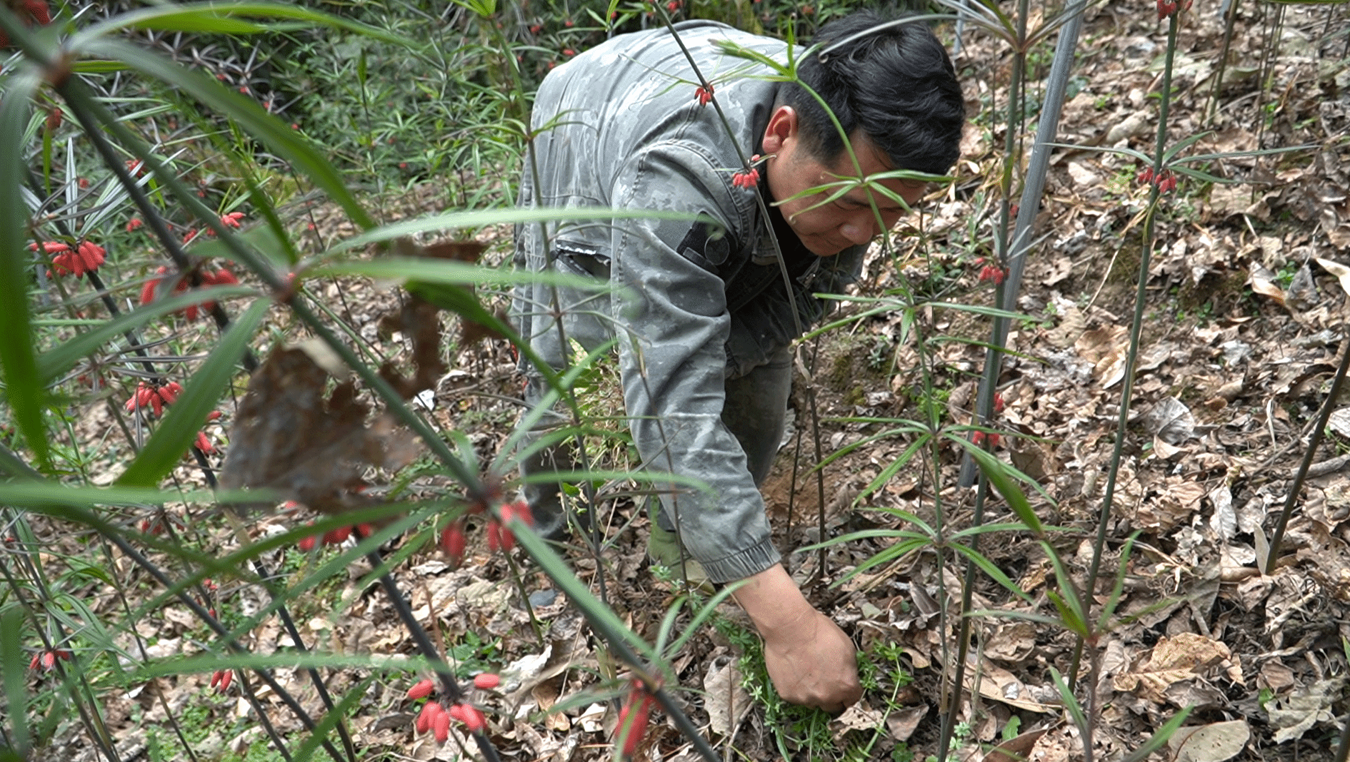 尹兆场社区共有斛农六百多户,辖区内森林覆盖率高达80%,但人均耕地仅有0.53亩,除了在有限的土地上种植石斛外,尹兆场社区一直尝试着多种方法扩种增收,其中2022年率先开展的林下“立体式”种植方式脱颖而出:在桤木树和桦桃树上,将石斛苗绑在树上让其依附而生,大树下面同时种上喜阴不喜阳的黄精,二者密切相依、共生共荣。