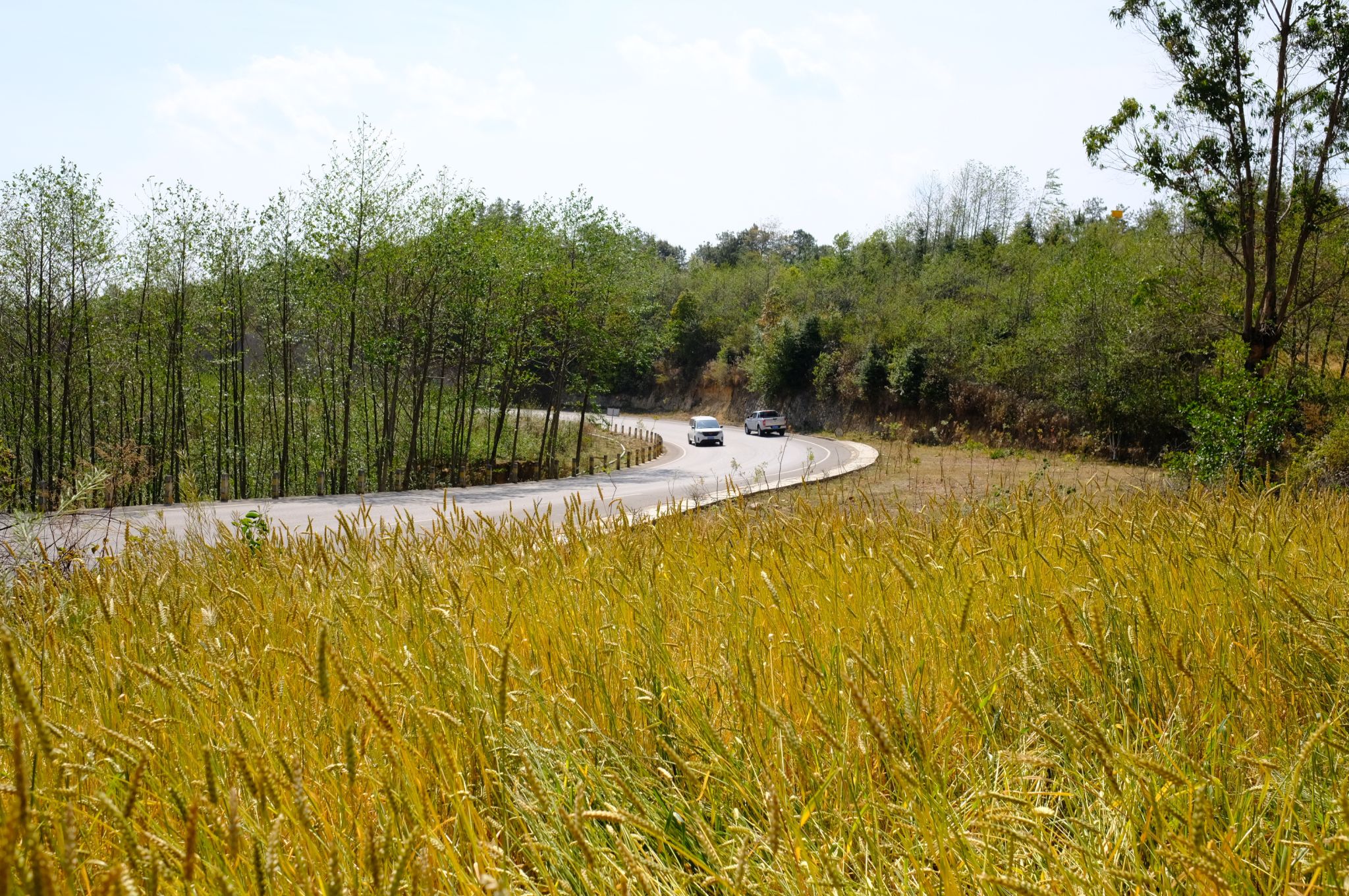 龙江乡的稻田公园,每年十一黄金周,大量游客蜂拥而至,举行抓田鱼比赛、摄影大赛,赏龙江万亩梯田美景,品尝龙江美食“海陆空”、油炸牯子鱼、田螺……。游客何女士说:“来龙江一路上郁郁葱葱的,非常地治愈,旁边还有龙江湖,非常漂亮,路边上的农家乐也非常美味,我们吃得开心,玩得开心,下次还会再来的。”龙陵县结合农旅文化建设,2022年6月开工建设了龙山镇至龙江乡绿美农村15.158公里,项目总投资为150万元,采用乔灌结合的方式进行道路绿化美化,完善停车场、休息区、花园、厕所、交通标线等服务配套设施,同时修复沥青混凝土路面,增设挡土墙以及边沟等,项目于2023年7月完工。结合全县各乡镇农旅文化建设,还打造了通往龙新乡勐冒农庄“共享菜园”、蚌渺湖网红打卡点、雪山秋场、雪山瀑布、镇安镇北艺术田园景、碧寨猴城风光、平达乡花桥晚市等等一大批农旅结合的绿美公路,真正打通交旅融合最后一公里,助力乡村振兴,实现“交旅游”深度融合。