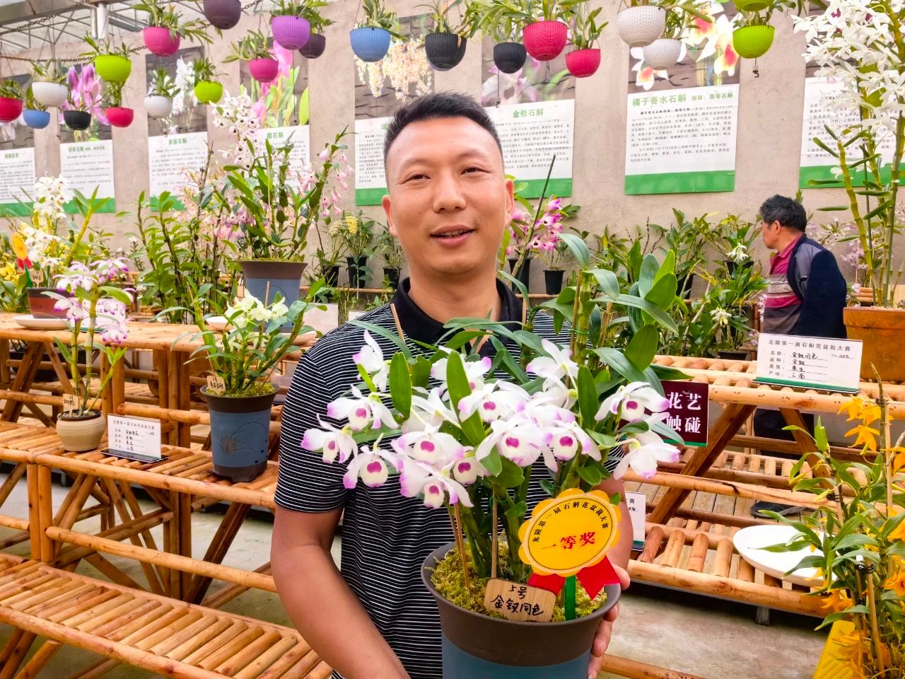 来自德宏的李正才,种植石斛花卉已有10余年,第一次参赛就夺得一等奖,幸福之情溢满脸上。