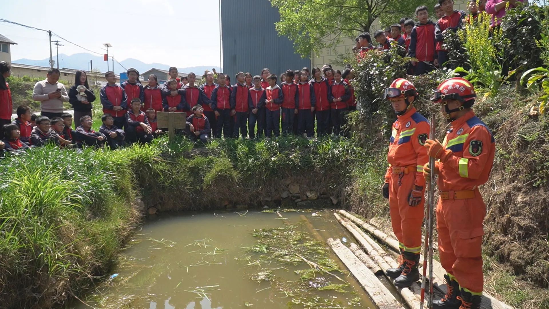 活动当天,在消防员和老师带领下,学生们来到校外一处池塘,现场观看消防员介绍野外池塘的危险,学习如果自己或者同伴溺水后如何自救。