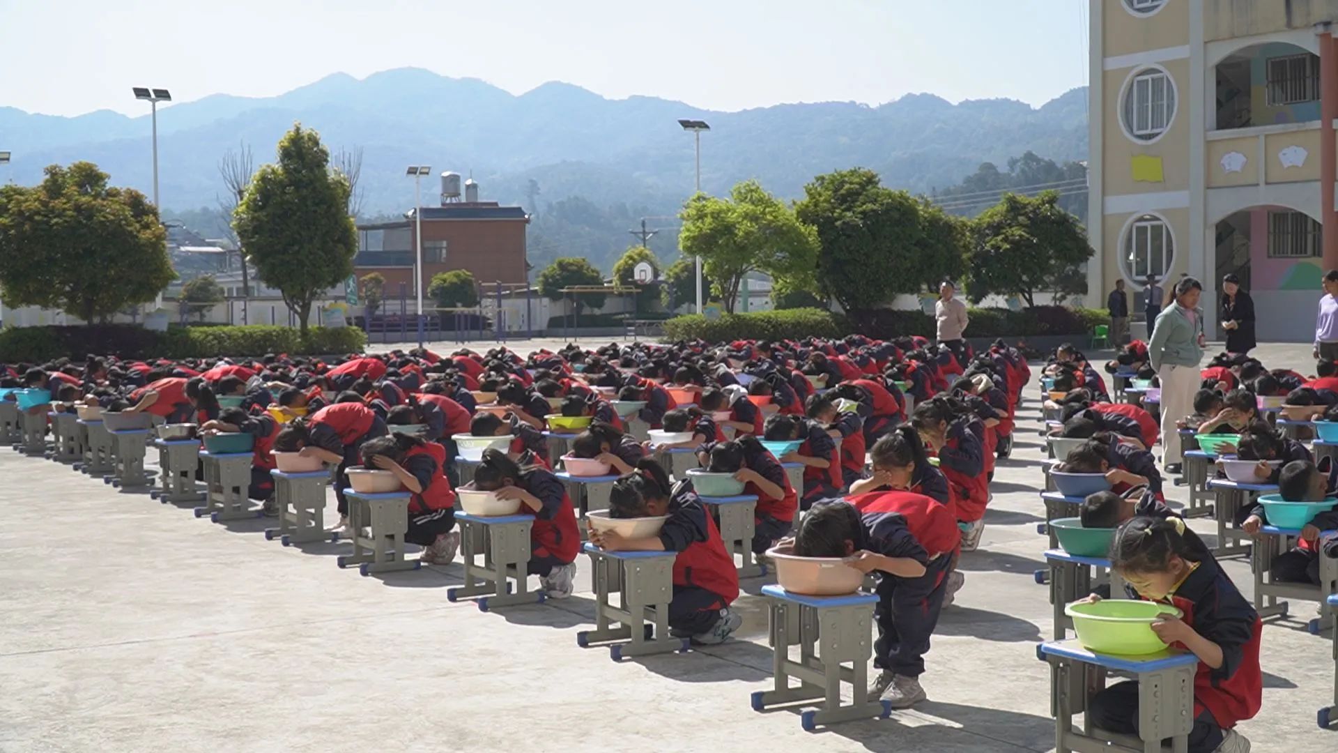 “水库、池塘、小河边游泳的危害及一些简单的自救方法,同学们有没有去外边游过泳呀?”在镇安镇大坝完全小学操场,消防员正在向学生们普及野外游泳的危害,为了进一步加深同学们防溺水的意识,消防员组织学生们拿来洗脸的水盆加满水,让学生体验窒息的感觉。