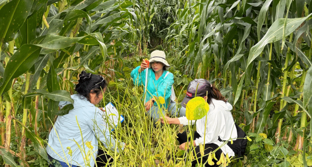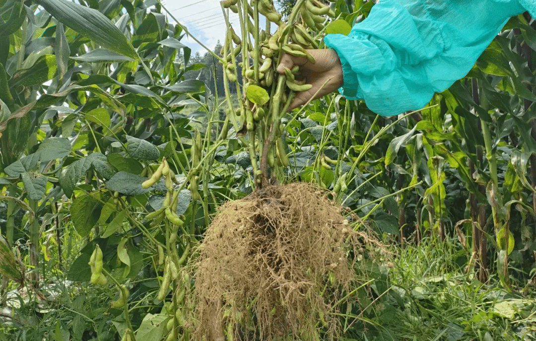 近日,龙陵县农业农村局农技人员深入龙新乡开展大豆玉米带状复合种植测产,茂密墨绿的玉米地头,农技人员正忙碌着量株高、数豆荚、数豆粒、数分枝,有条不紊地记录着相关数据。“快看,这株豆的根部固氮菌这么多”,科技人员随手拔起一株大豆。据龙陵县农业技术推广中心主任介绍,大豆根系发达、根瘤菌多、固氮能力强,有利于改善土壤条件、提升土壤地力,促进大豆豆荚饱满,可实现玉米增产、大豆增收。