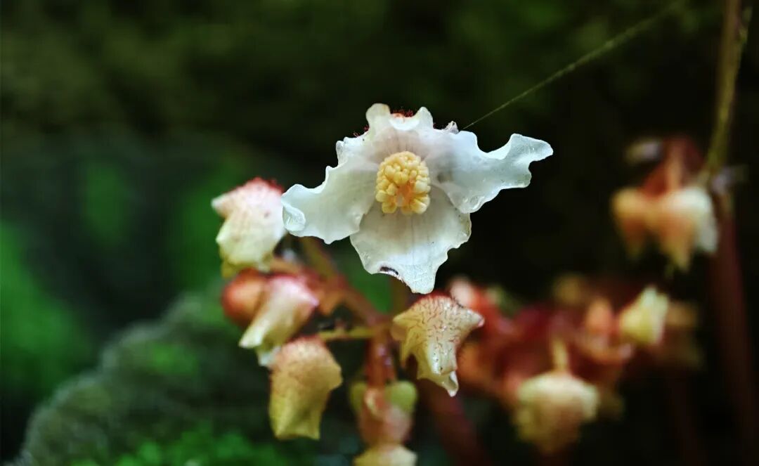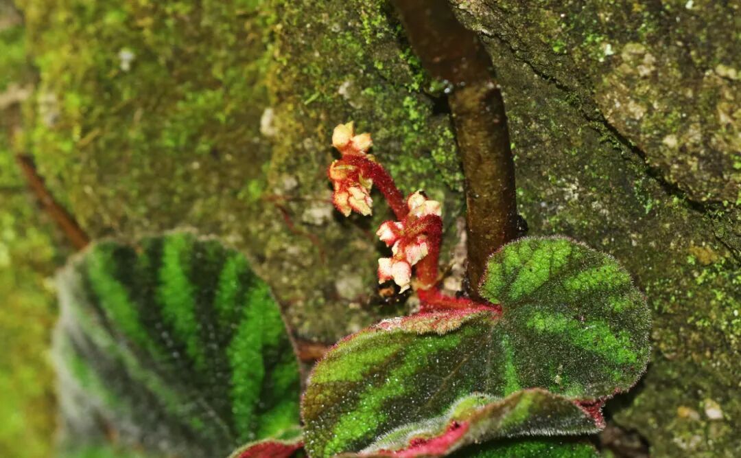 在秘境幽谷中,几簇变色秋海棠花悄然绽放在林下一处悬崖峭壁上,其粉红色花簇及复古色叶片与青绿岩石相映成趣,形成冬日里“幽谷崖缝藏秀色,石缝生花映日辉”的独特意境。变色秋海棠的褐红色花葶上,坠着色泽清丽的花蕾,细看宛若缩小版的荷包,格外玲珑精致。当阳光穿过枝叶缝隙洒到其花簇和叶面上。更奇特的是,那片片还留有湿润水迹的叶子。凸凹不平的叶面以深绿、淡黄、鲜绿等为主色调,这些颜色以叶柄、叶脉为起点自然散开。另外,在微焦镜头下可以清晰地看到,几只不知名的小昆虫,蹒跚在布满圆锥状绒毛的“绿毯”(变色秋海棠叶面)上,呈现出一幕幕动植物“和谐共生”的灵动图景。
