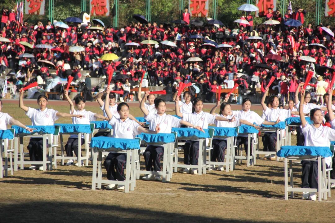 入场式结束,全体师生肃立致敬。运动员与裁判员代表依次登台进行庄严宣誓。在开幕式文艺表演环节,各类精彩节目轮番登场,迅速将现场气氛推向新高度。教师朗诵《教育绽放幸福》中,老师们用真挚的语调诉说着对教育事业的无限热爱与初心坚守;《少年有志》《越·青春》《傈僳人民歌颂党》等风格各异的舞蹈接连亮相,灵动的舞步、饱满的情感,赢得了台下掌声与欢呼声,让整个校园都沉浸在欢乐热烈的氛围里。