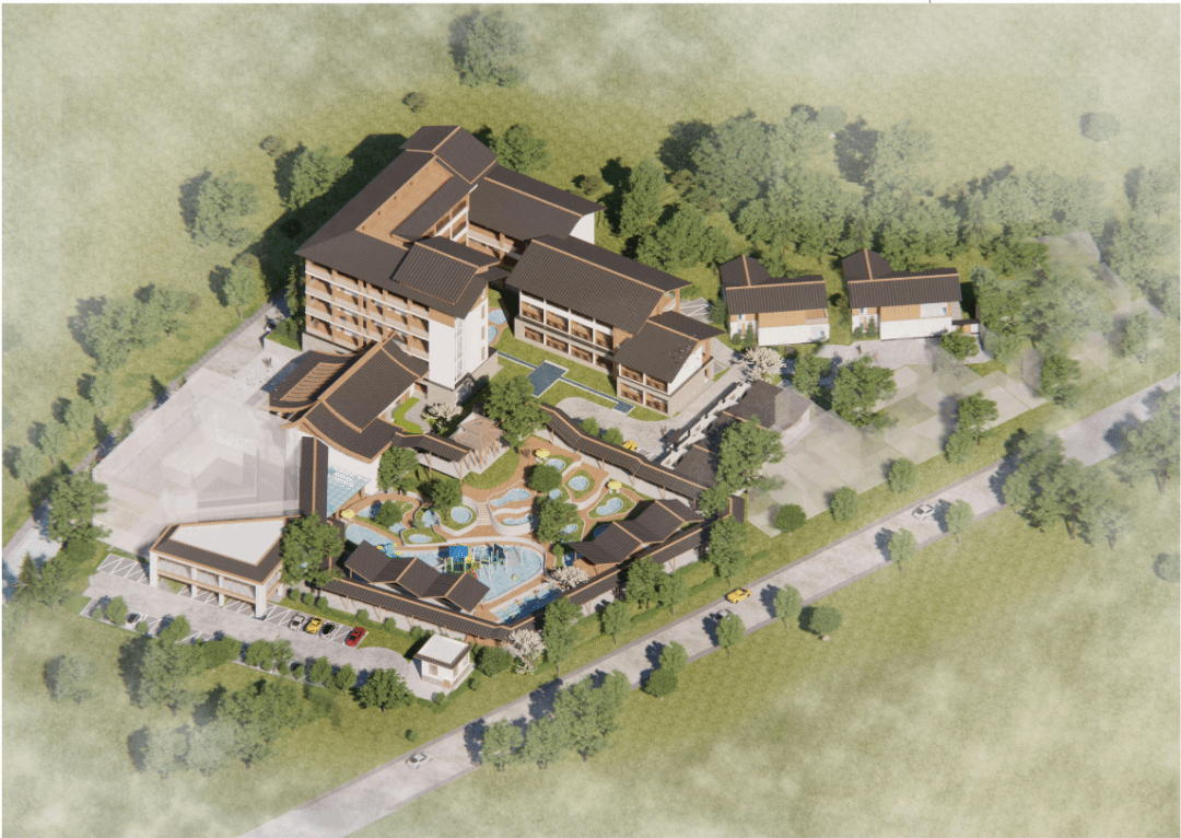 项目总建筑面积7875平方米,建设内容全面贴合高端度假需求。其中,新建一栋五层接待中心,建筑面积5463平方米;新建三栋二层合院,建筑面积688平方米;另新建一栋汤屋(213平方米)和一栋开放式汗蒸疗养房(135平方米),并配套建设一座连廊(539平方米)。此外,项目还配建了烧烤区、厨房、水泵房等设施(建筑面积837平方米),并同步实施道路、停车场、供排水、供电及景观绿化等附属工程,全方位完善酒店服务配套功能。