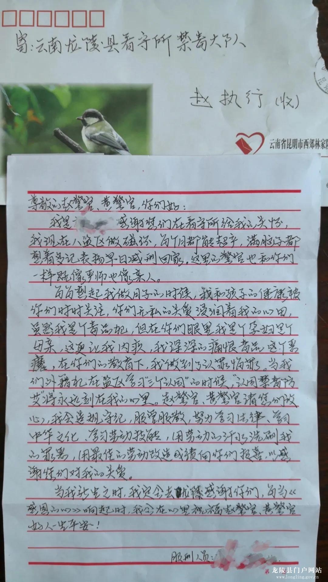 “尊敬的赵警官、黄警官和关心过我的所有龙陵警官,我现在(服刑)在八监区(改造)做瓷杯,月月都超产多记表扬,这里的警官和你们一样像严师更像亲人......。”这是近日来自高墙下一名服刑贩毒境外女子写给龙陵县公安民警的一封改造报喜信,寄信人是该局曾侦办的一起禁毒案件当事人。这其实已是寄信人第二次给办案民警写信了。是什么原因让一名投牢服刑贩毒女子对办案、管教民警念念不忘?读完这封报喜信,一个闪耀人性光芒的执法故事再次展现在人们面前。
