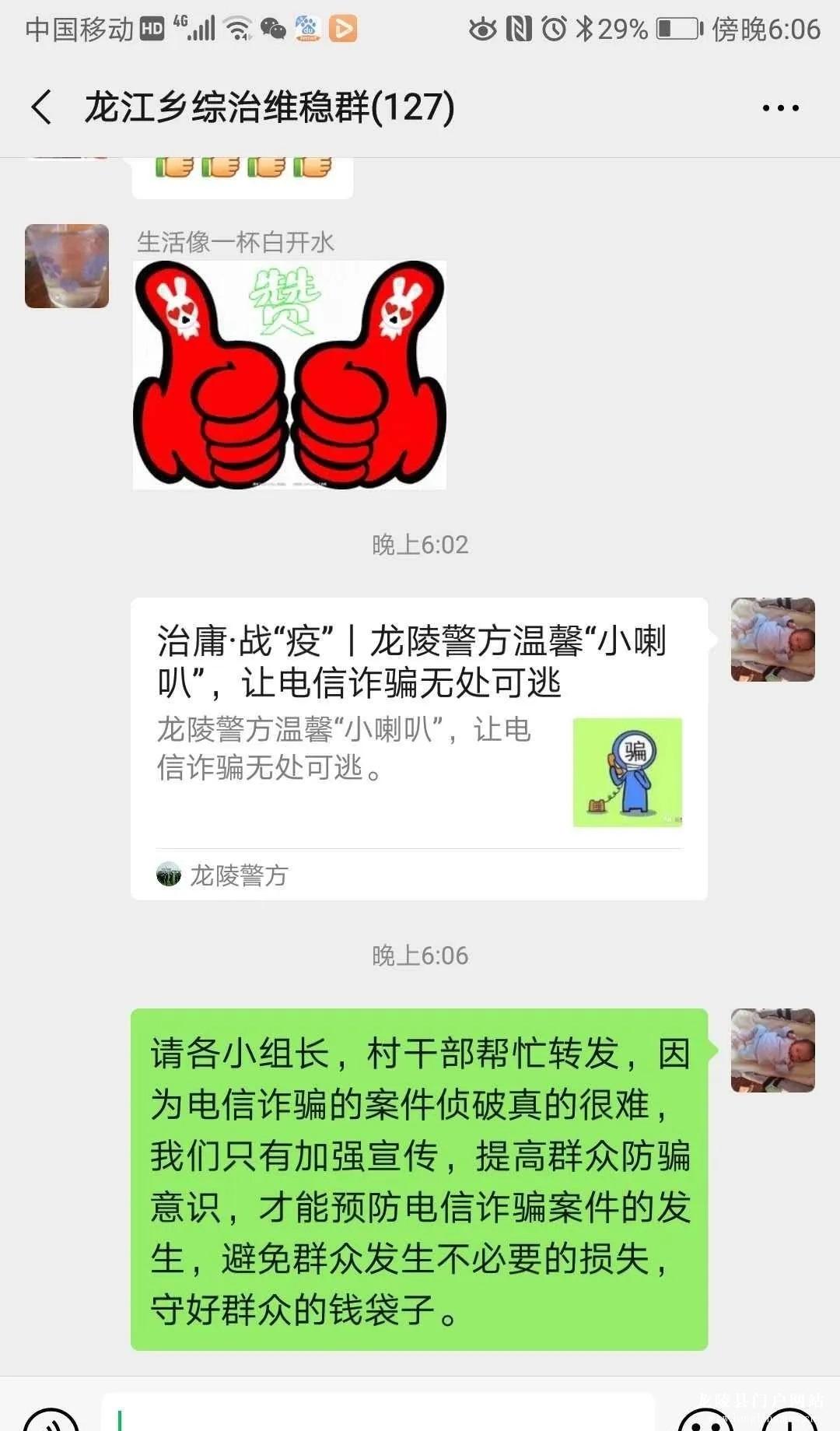 利用群众日常生活中常见的微信、QQ、美篇等新兴媒介和传统的发放宣传单、粘贴宣传海报、警民座谈会、大喇叭等相结合,开展“狂轰滥炸”式的防范宣传,提醒广大群众牢记“三不一要”,即不透露、不轻信、不转账,要及时报案,尽最大努力提高宣传覆盖面。深入村寨、街道、农户,针对中老年群体、学生、妇女等易受骗群体强力开展“一对一”防骗宣传,尽最大努力消除宣传死角,增强群众防骗“免疫力”,确保防电信诈骗知识宣传的广度和深度。同时通过发展法制宣传治安志愿者开展不同形式的防骗宣传活动,以起到群防群治、事半功倍的效果。截至目前,龙江在疫情防控期间,开展防骗宣传活动20余起,发放宣传单500余份,大喇叭喊话20余起,微信发放宣传信息20余条,受教育人数达20000余人。
