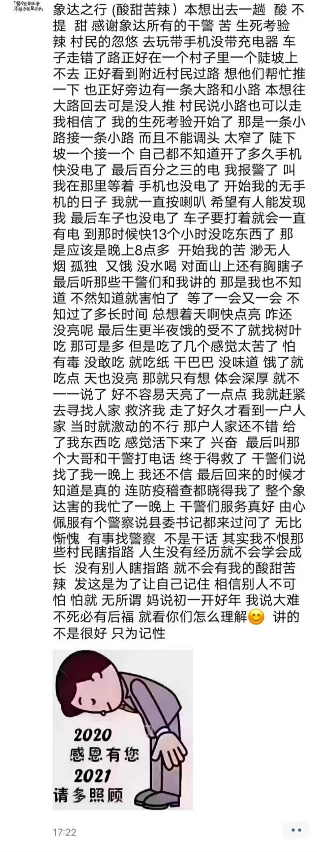 通过警民合力救援,报警男子现已平安归家。事后,他在朋友圈写下了他的惊险经历,也表达了对派出所民的感谢。