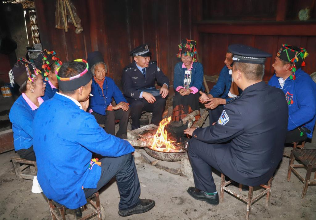 在阿昌族村民的带领下,派出所民辅警走进阿昌族文化展览馆,了解阿昌族习俗文化,走进阿昌山寨,了解阿昌族村容村貌和居住环境,走进阿昌族群众家中,了解阿昌族群众的生产生活情况和遇到的困难。民警与“亲人们”围坐在火塘边拉家常,共叙警民情,向他们征求市域社会治理现代化创建的意见建议;在篱笆小院里,宣讲党的政策方针和法律法规,阿昌族群众说着感谢的话语,将阿昌帽儿戴给所长赵尚文,所长瞬间变身阿昌小伙,寓意“我视你为亲人”,更加贴近了警民的心。
