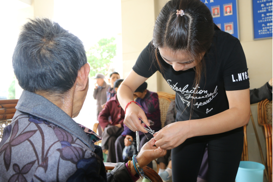 下午4:00时,志愿者们来到西山坡县中心敬老院,先为老人们送上水果和糖果。随后,志愿者们迅速投入工作状态,相互配合,积极主动地打扫住宿区卫生,耐心细致地为老人按摩和修剪指甲,并与老人进行亲切交谈,倾听他们年轻时的故事以及询问现在的生活和身体状况,几名志愿者搀扶老人走出房间走一走看一看,活动活动胫骨,场面真挚暖人,气氛和谐融洽,让老人们觉得非常开心。