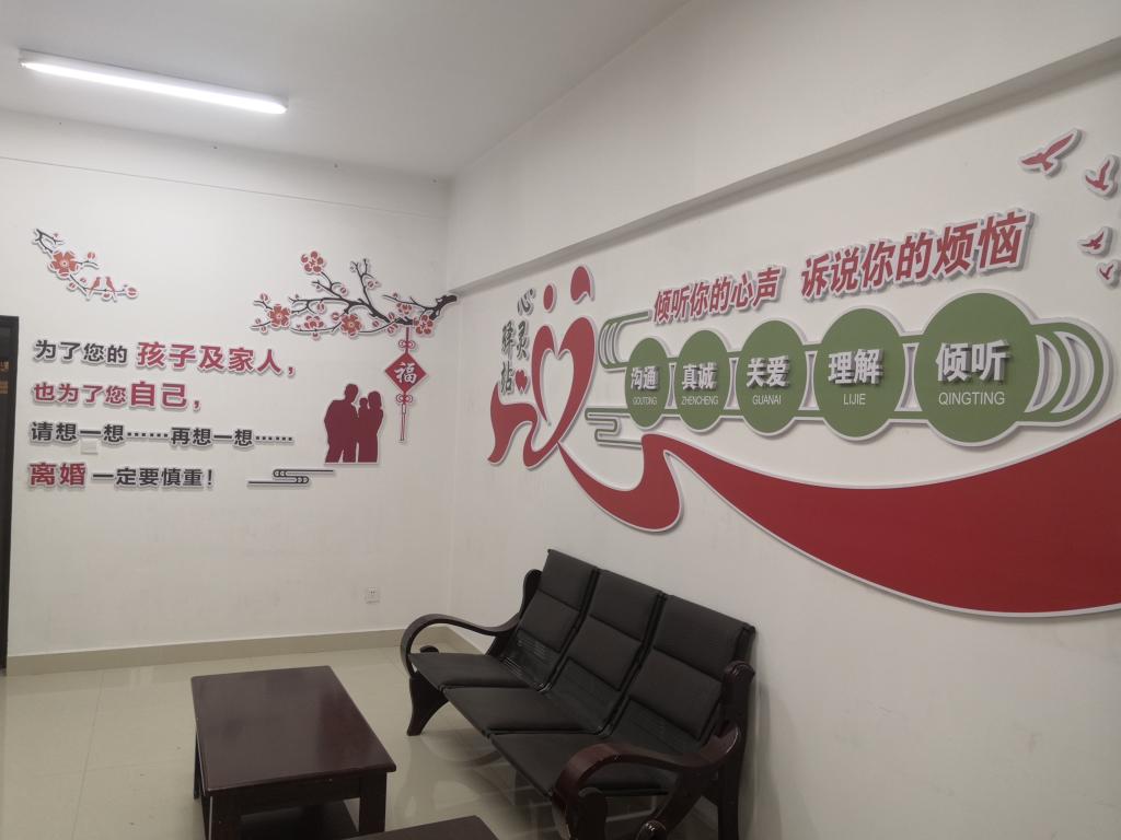 一是完善场所设施建设。按照国家有关规定标准设置婚姻家庭辅导室,总面积约20平方米。装饰营造温馨舒适氛围,张贴体现婚姻文化的宣传箴言、图画,倡导群众理性对待婚姻矛盾。