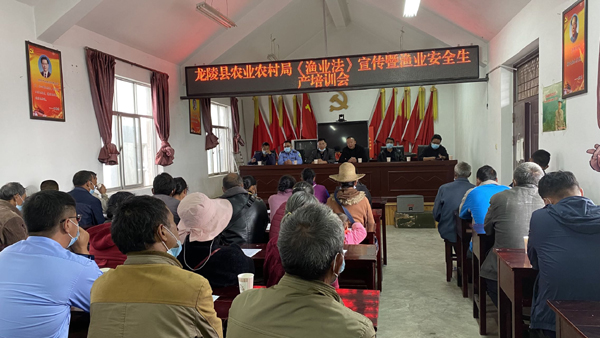 11月23日,由龙陵县农业农村局分管副局长带队,组织县农业综合行政执法大队、县水产工作站联合开展渔业安全生产宣传活动。分别在龙新乡龙新村和蚌渺村开展渔业安全生产宣传知识培训。会议要求,要切实加强水产种质资源及生态环境的保护,凡从事捕捞作业的单位和个人必须依法办理捕捞许可证,禁止使用炸鱼、毒鱼、电鱼等破坏渔业资源的方法进行捕捞,不得造成水域环境污染。