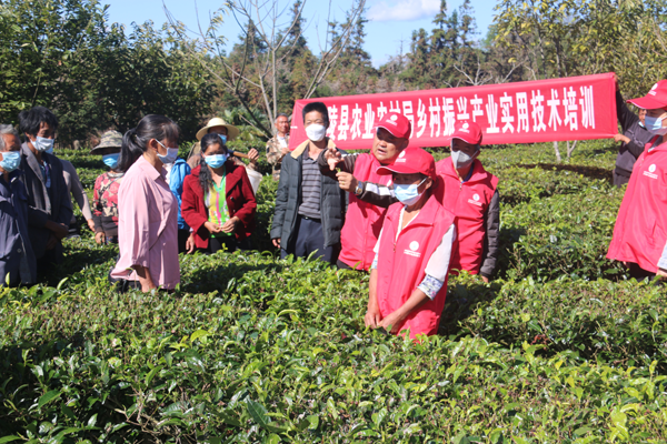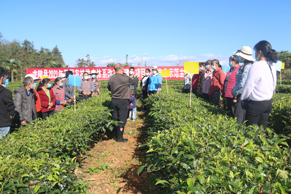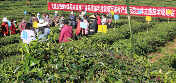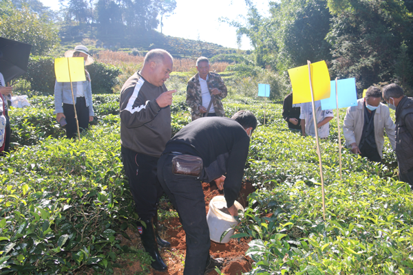 12月7日,龙陵县2021年基层农技推广体系改革和建设项目茶叶产业示范主体主推技术现场会在龙眉茶基地里有序开展,龙陵县农业农村技术服务中心茶叶技术专家张维成一行3人到现场为农户指导有机肥料替代化肥施用、茶园病虫害绿色防控技术(粘虫蓝、黄板)、茶园苔藓和地衣(树毛衣)正确防治办法及茶园茶饼病、蚧壳虫的有效防治用药,有效提升农户茶园科学种植管理水平,为助力春茶提质增效,增产增收夯实了基础。