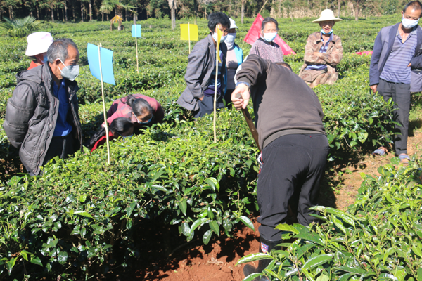 项目培训有条不紊的进行着,指导员采用通俗易懂的语言给农户讲解,茶农们听得非常认真。在如何正确施有机肥技术指导问题上,为了让茶农更好的理解,指导员边动手示范,边开挖出一条适合施有机肥的土沟,按4袋(160kg)/亩的施肥量进行施用,保证了有机肥最大的吸肥力,边施边回填,为来年春茶增收做好准备。