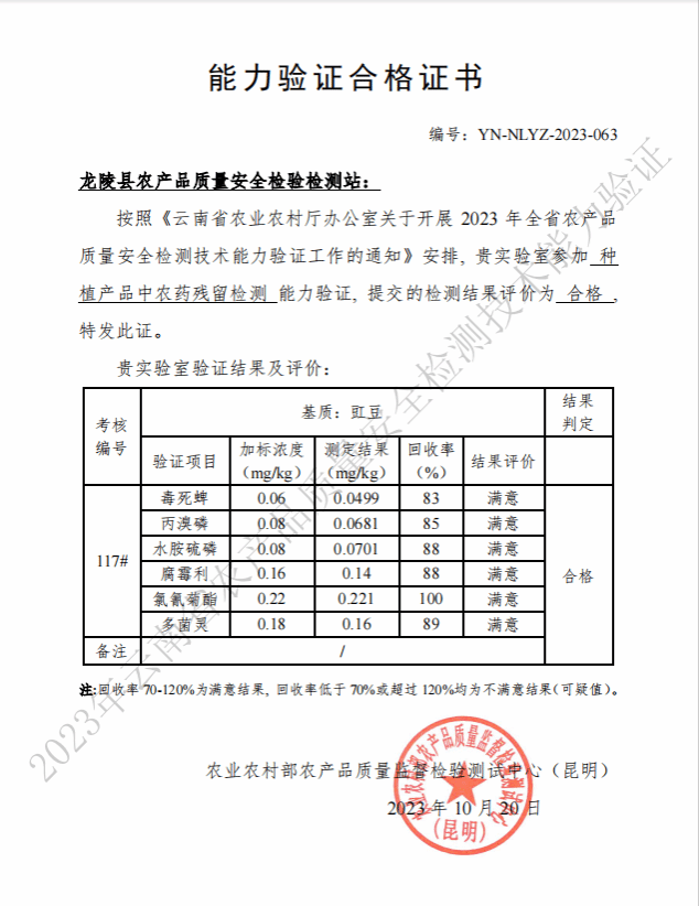 通过此次验证,再一次体现出龙陵县农产品质量安全检验检测站的实验能力和检测水平,展现出检测人员过硬的技术能力和业务水平。下一步,县农检站将继续夯实检验检测技术水平,提升检测公信力,一如既往地严把检测质量关,以科学、公正、准确、可靠的检测为龙陵县种植业产品安全事业“保驾护航”。