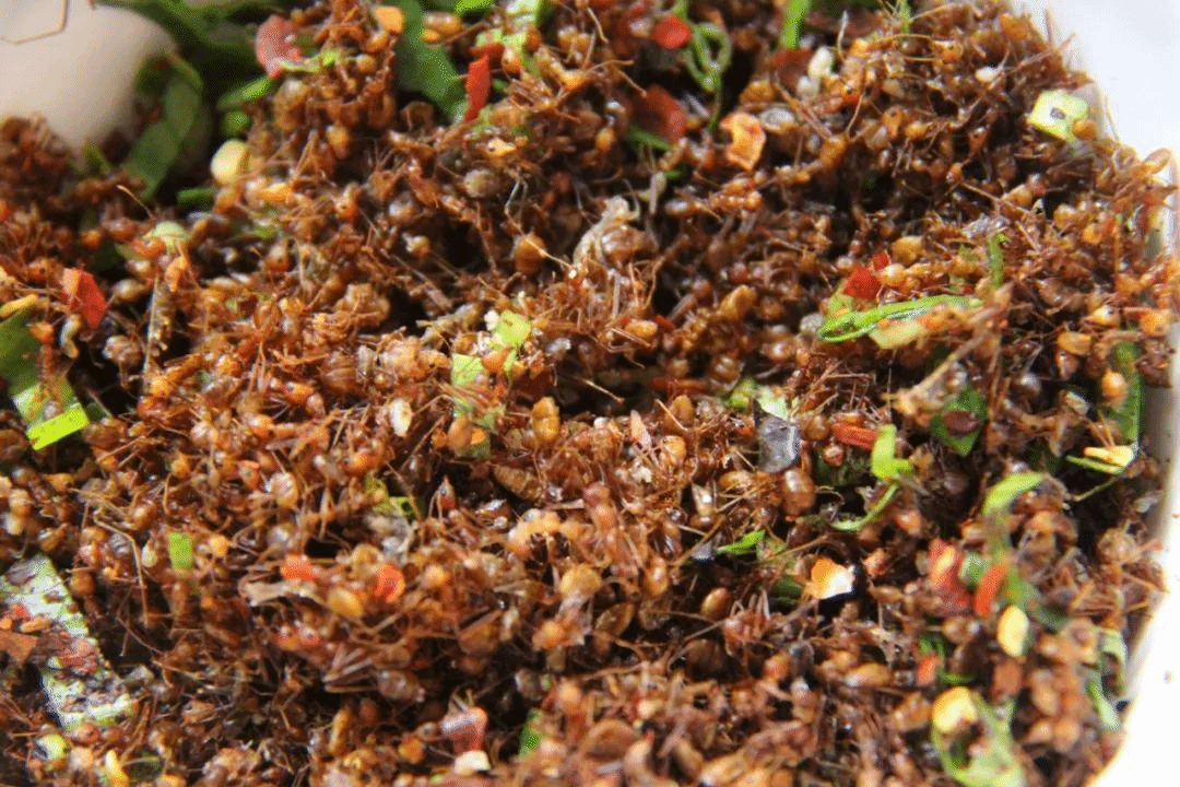 炎炎夏日,怎么少的了一道可口的凉拌菜呢?酸蚂蚁,一种含有多种游离氨基酸、蛋白质水解氨基酸、粗蛋白质和热量的美味,是龙陵人餐桌上最喜爱的美食之一。从大树上将酸蚂蚁捕捉回来后,清洗干净,用来拌各种凉菜,那味道别提有多爽口了。