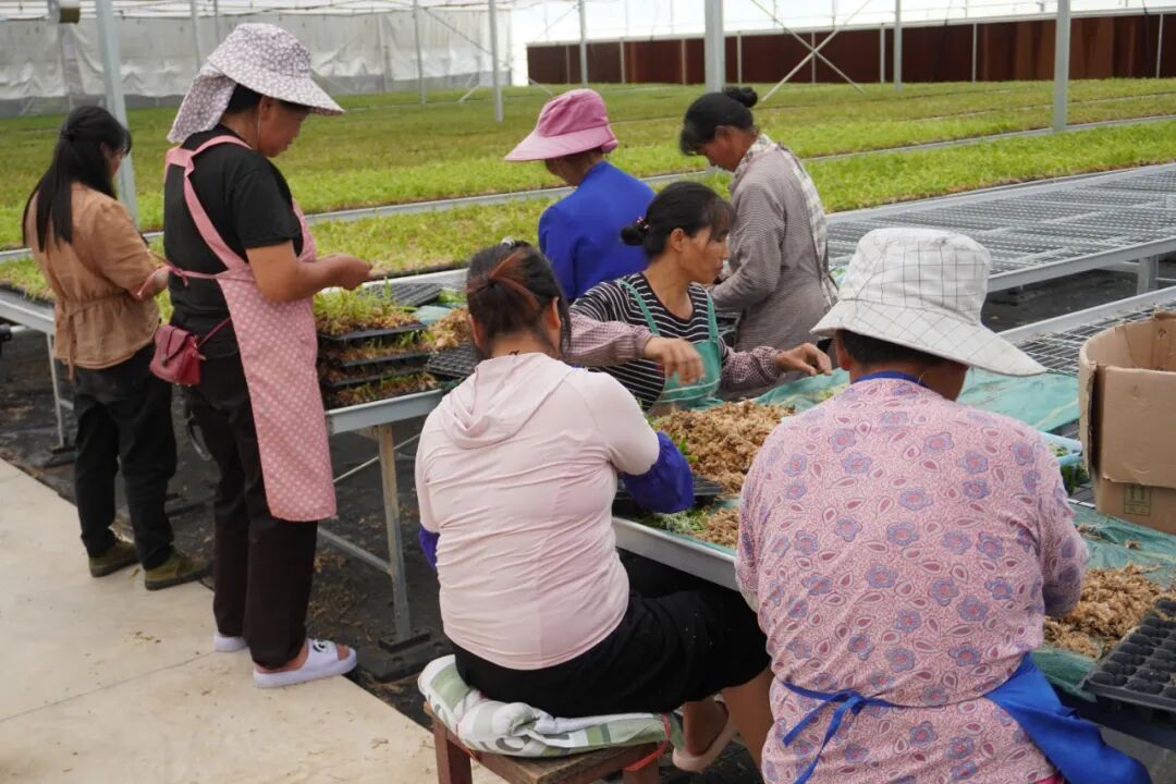 家门口端稳“就业碗”。基地依托企业规范化管理,为当地村民提供大量“不离乡、不离土”的工作岗位,目前已稳定吸纳50余人实现就地就业,人均月收入约3000元。在种植和生产旺季,还通过灵活用工机制每天提供超过100个临时岗位,显著缓解农村剩余劳动力就业问题。村民实现“顾家增收两不误”,村集体也获得稳定租金与分红收入,“就业之花”真正开在了乡亲们的家门口。