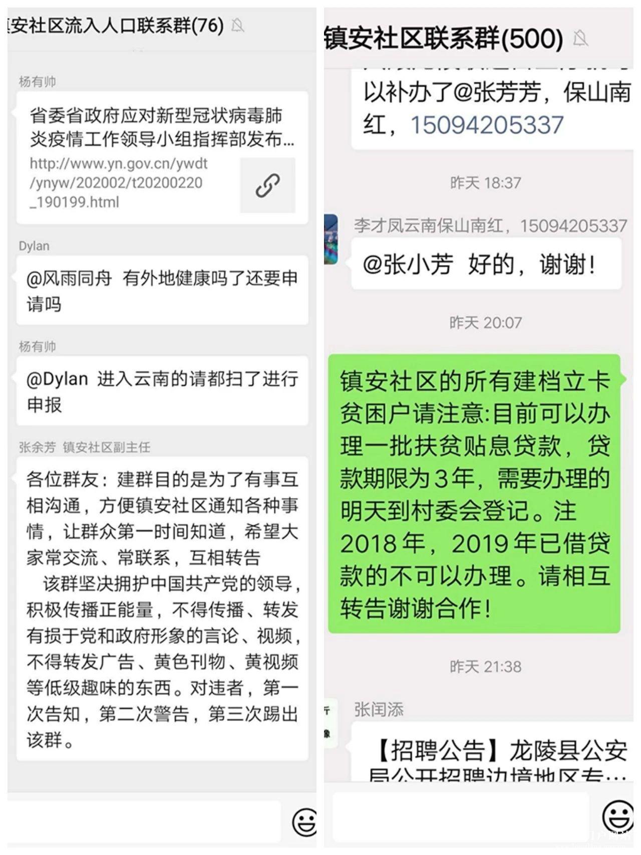 镇安镇为了贯彻落实好省委、省政府“从全面防控向精准防控、重点防控转变”的工作要求,撤销了辖区内所有的检测点恢复交通畅通,在保障群众生产生活、经济发展的同时,迅速调整疫情防控策略,采用“大圈划小圈、网格加微信、微信连千家”的方式,将微信群的作用最大化,精准防控。