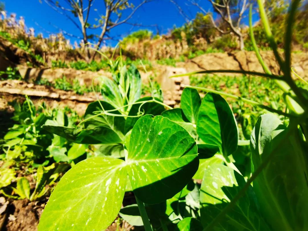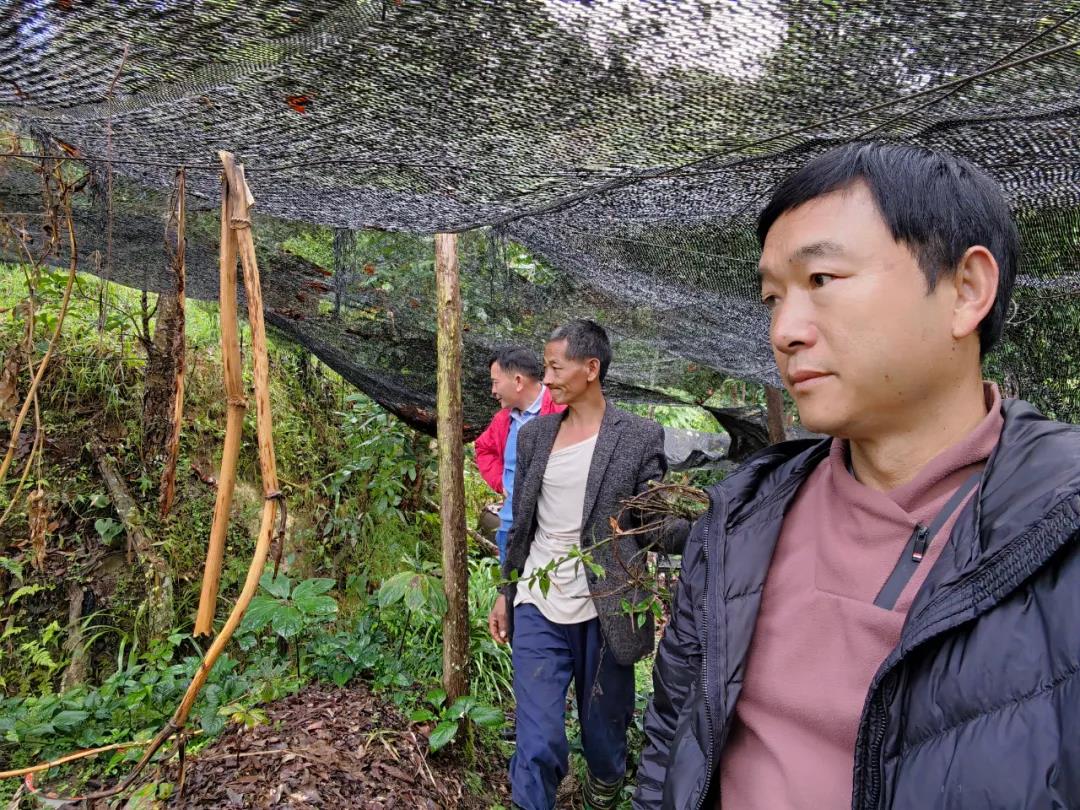 心头又是一震,瞬间想到人生无常。我们请范绍枝带我们去他的地里看看。距离不远,路很陡。一亩多山地,阶梯式,条块分割,大部分铺了遮阴网,种上了药材——这是范绍枝久病成医,便于自己用药的选择。其它地块有用来养蜜蜂的、养鱼的、种菜的。范绍枝随手摘了一把青菜,笑笑说是自己种的,给我们拿到村伙食团尝尝鲜。