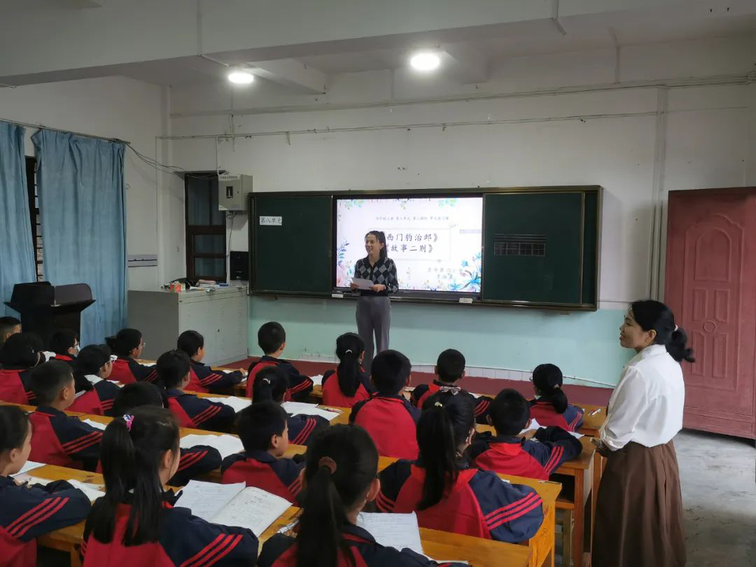 第一节课是芒市第三小学的李拾英老师带来的语文四年级单元预习课。李拾英老师在教授《西门豹治邺》这一课时,结合了“理解故事情节”这个最重要的语文要素,读练结合,使学生初步掌握了理解故事情节的方法——题目扩展法。