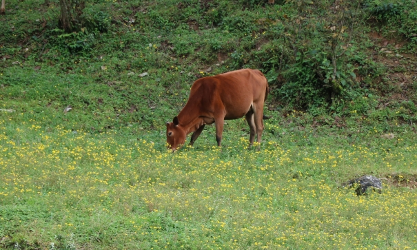 乡村路的路面已得到硬化,养眼的风景处处可及。路边放养的小黄牛与满地开花的马鞭草(学名叫“西南委陵菜”)毫无违和地组合起来,像是童话故事里和谐的开幕。薅一把野草,递给牛,它会好奇地抬起头用湿漉漉的大鼻子闻闻,在你不注意的时候用就舌头把草卷进嘴里,顺便还会舔到你刚刚伸出去的手指。