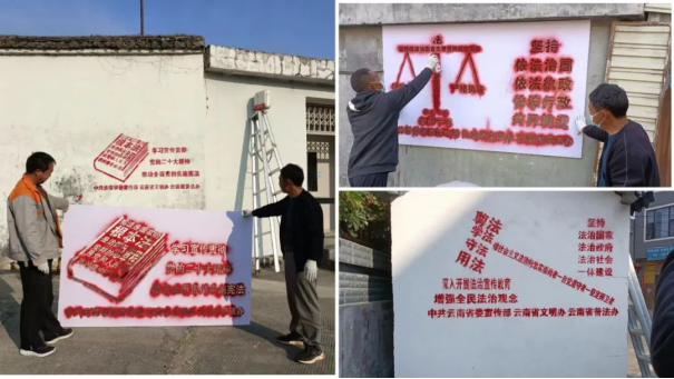 社区工作人员在辖区醒目显眼的墙体上喷绘普法强基补短板专项行动相关宣传标语21条。