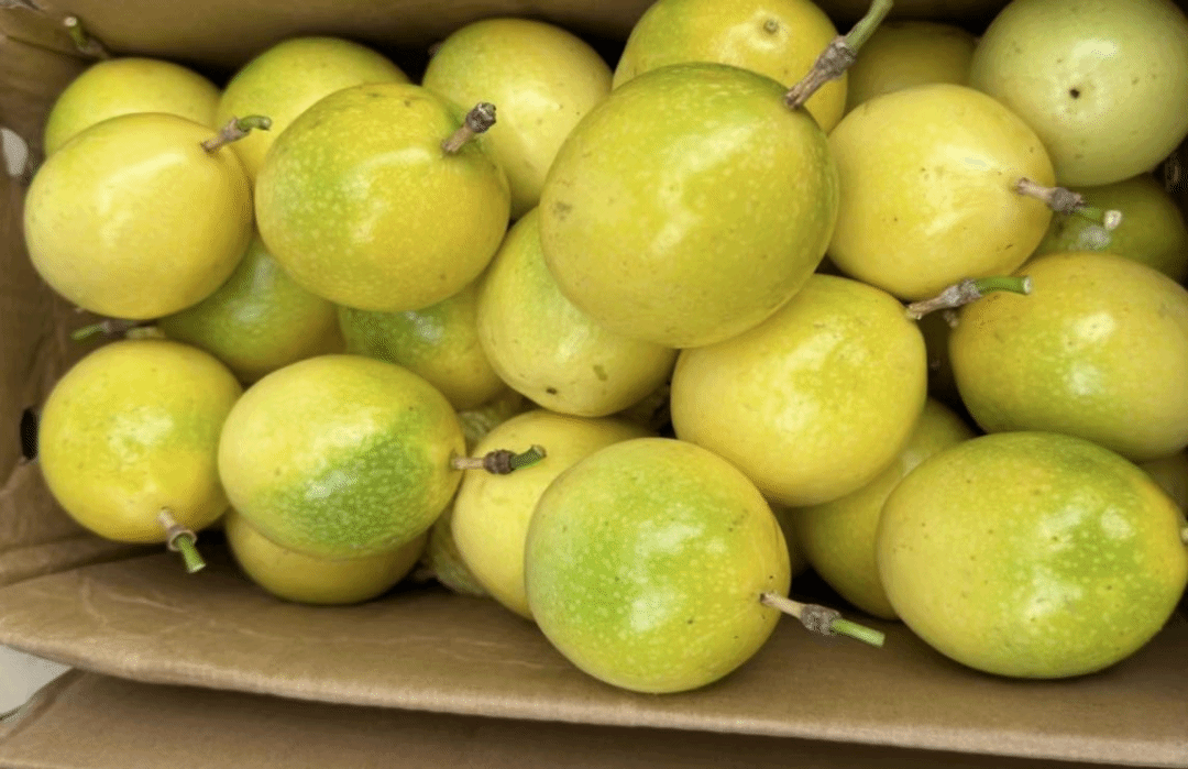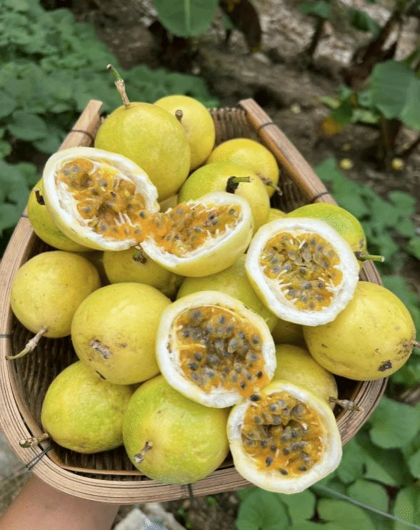 此时若走进果园,放眼望去,能看到绿油油的黄金百香果藤蔓爬满棚架,光滑饱满的果子挂满枝头。