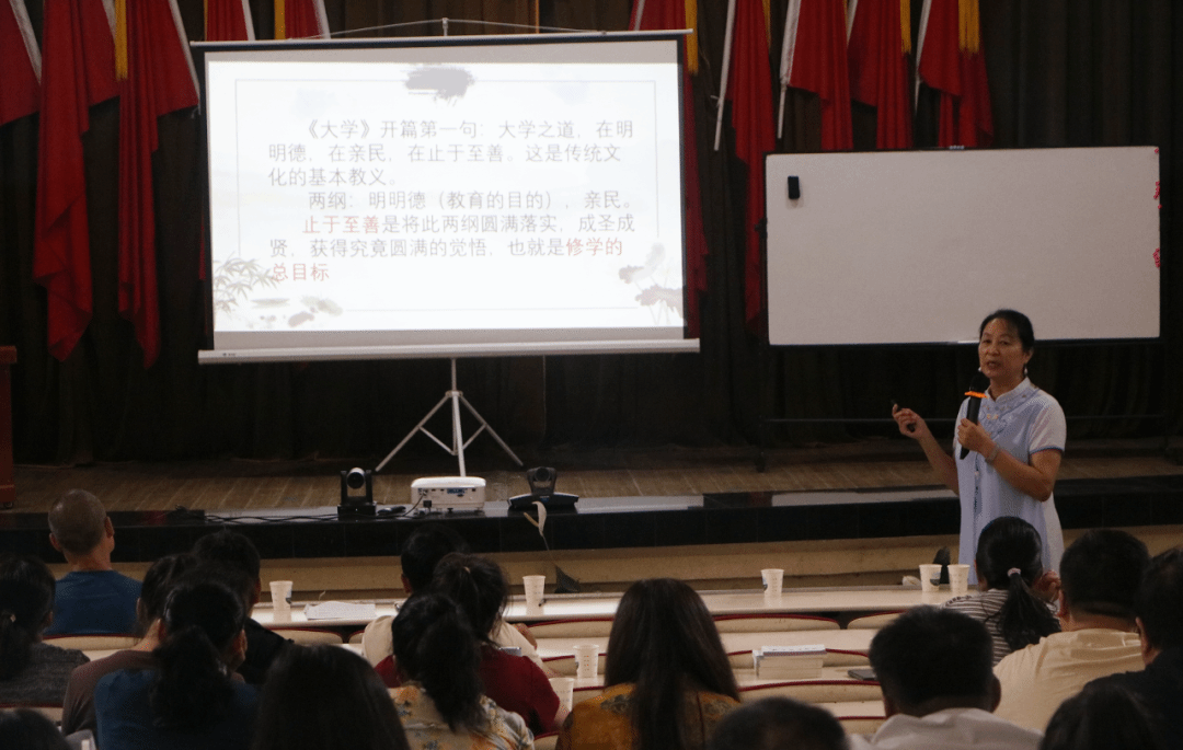 “我们这一次给大家梳理出来中华优秀传统文化融入基层综合治理的方方面面,先让大家有一个了解,后期会不断地深入这一块,让大家最终用到自己的生活和工作中,真正树立起文化自信。”按照这样的初心和定位,研究院副院长刘银刚分别给大家分享了修身的重要性及传统文化融入基层社会治理的路径与方法,重在“读书明理”“正己化人”,即梳理、建设和引领,而不在强硬“治理”。运用成功案例说明,治理只是一时的手段,正心诚意建设、巩固和美乡村才是目的;张明杰老师谈知行合一促和谐发展,指出知行合一的核心是,用良知良能,“知行”一体去运用;刘永嵛老师结合当今家庭矛盾、社会问题,谈家庭家教家风建设重要性;兰昌东老师带领大家开展传统文化社区化实践——文化养正操。“吾日三省吾身”“用责人之心责己、恕己之心恕人”“把五伦关系映照在家庭里、同事中、工作上”“爱子教之以义方”“诗书继世长”等传统文化观点简单明了、易懂好用,引起大家共鸣;老师们把事理和事例相结合,深入浅出,循循善诱,发人深省;文化养正操用简单有序的拍打方式疏通经络、和谐关系,达到快乐上班、健康工作的效果,得到大家认可。