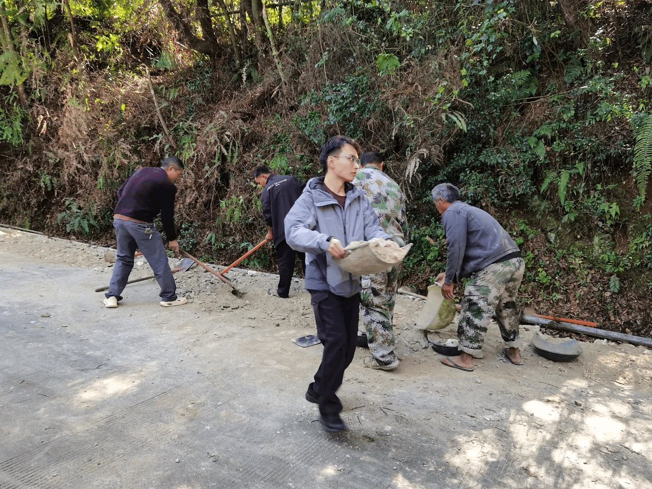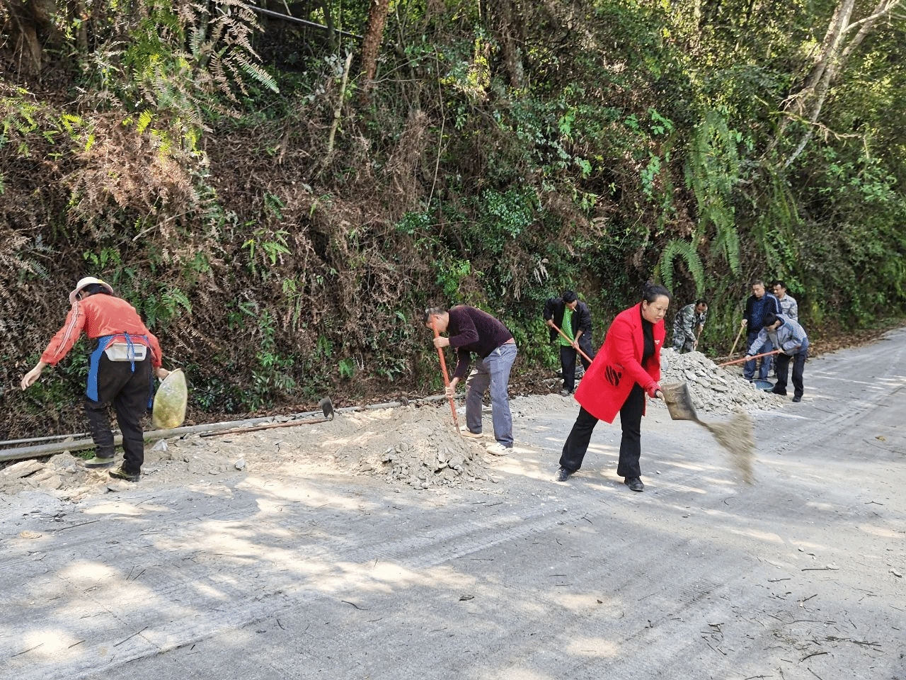 路肩的损坏不仅给村民的日常出行带来诸多不便,还破坏了整体的路容路貌。“这里坑太大了,先填两个大石头再盖沙子......”,在党总支书记的带领下,大家分工协作,就近取材补修路肩。与此同时,众人还清除了路边遮挡视线的植被。经过一番努力,长达 2 公里的路面及路肩得以修整铺平。