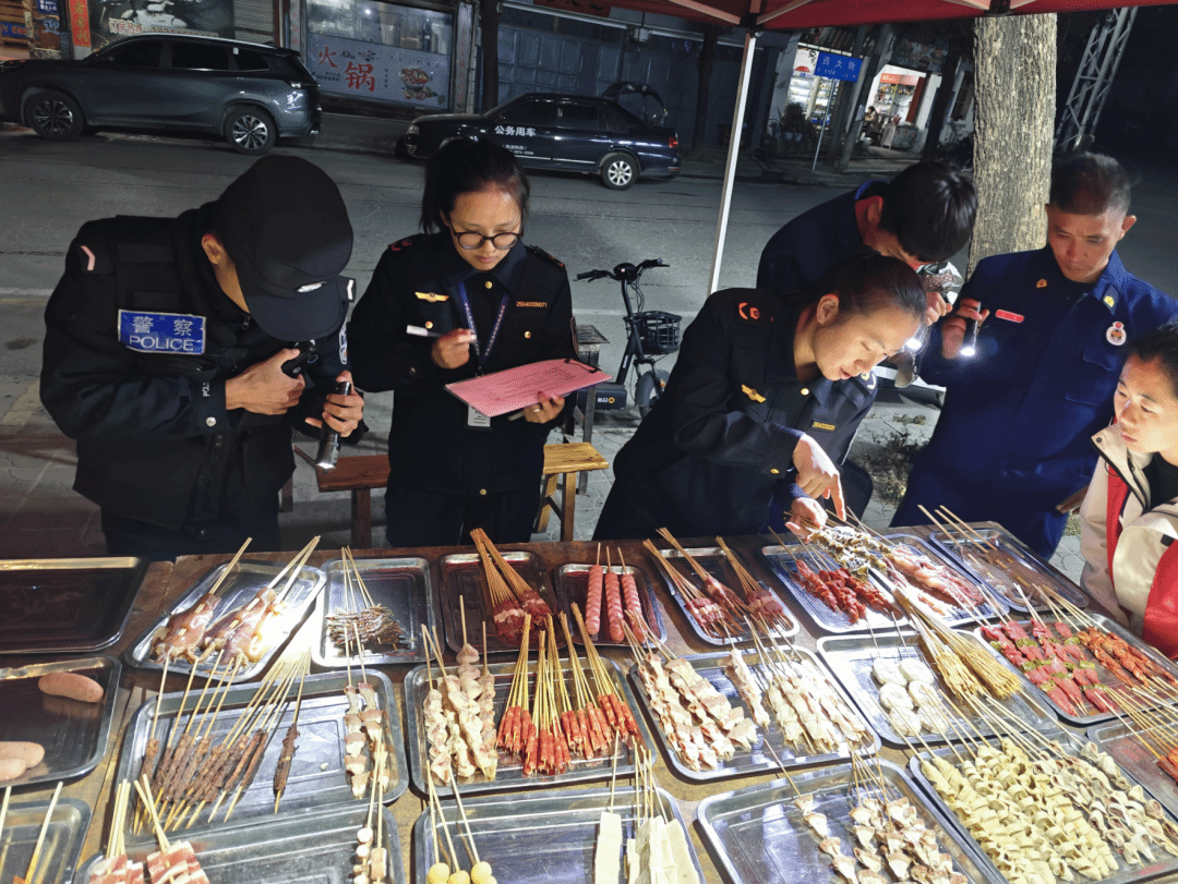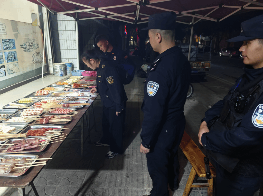 食品安全有力保障。镇市场监管所工作人员走进烧烤摊(店),对食品原材料的采购渠道、食品加工过程的卫生状况进行细致检查,保障百姓“舌尖上的安全”。