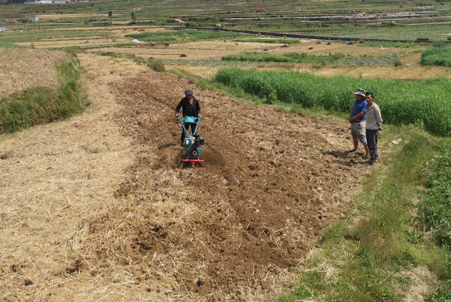 二硝坪寨子前边,为了规范种植、科学种植,今年进行了农田整改,把弯弯曲曲的小田改成了大田,刚平整好的田里石头很多在垄墒时很困难,但村民们也没有放弃玉米的播种,边捡石头边垄墒子播种玉米。