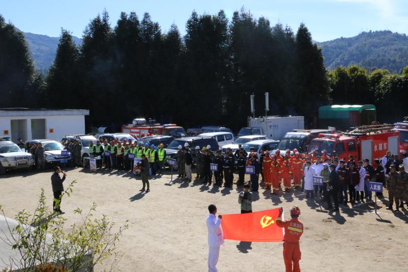演练模拟龙新乡发生里氏6.0级地震,震中为绕廊社区,地震导致震中附近水、电、路、通信中断,部分群众被埋受伤。在前往灾区途中由于地震引发的道路阻塞致使车辆无法驶入灾区,路障组迅速进行道路抢修,而其他救援组则带上救灾物资徒步进入灾区。在到达灾区后,各组人员搬运救灾物资、搭建救灾帐篷、扑灭受灾火源、搬运救治伤员等,各环节都有条不紊、井然有序。在救援中,救援组发现了一名“重症病人”,情况十分危急。于是,龙陵县首次启用直升机救援将“病人”送至医院。