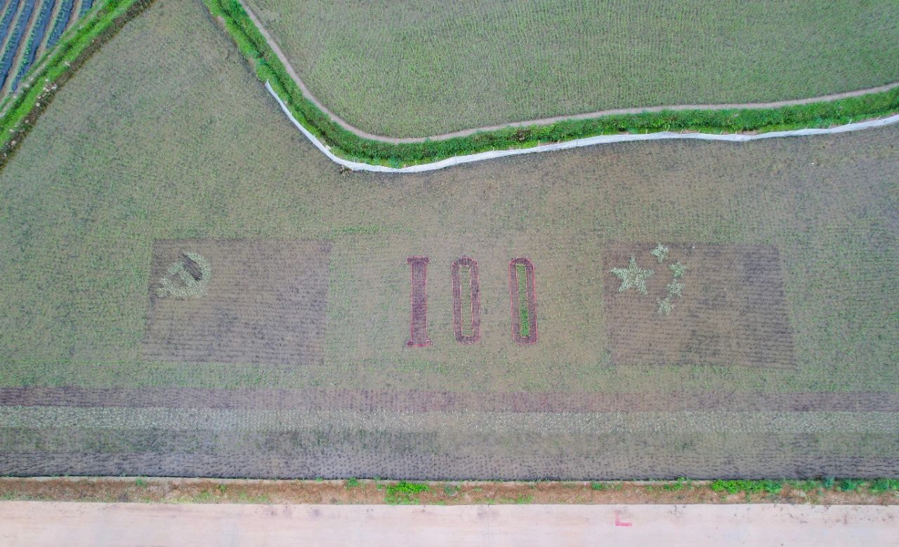 半天时间,一幅由“白、绿、红、浅紫、深紫”五色水稻巧妙地绘出上半部分由党旗、国旗、数字100,下半部分由5条彩色道组成的巨型稻田画,党旗、国旗寓意全乡干部群众对党对祖国的忠诚和深深地爱,数字100寓意庆祝中国共产党成立100周年华诞,五条彩道寓意对坚持走中国特色社会主义道路的坚定支持。