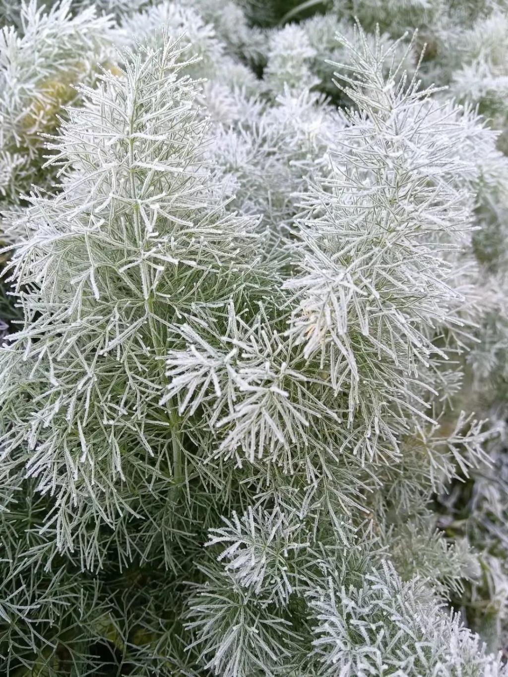 霜见于早晨,气凝为露,而露凝为霜,草木零落。开在寒冬里的霜花,在这特别的季节里装扮着这个世界。一夜间,屋顶上、田野、草地、路边的草、蒿子的叶都铺上了一层晶莹剔透的“白霜”,整个龙新仿佛披上了一层迷人的薄纱,处处白的晶莹,美丽至极。剔透零星的小冰晶,宛若银色“陆地珊瑚”,在阳光的照耀下折射着点点光芒,美丽万分。