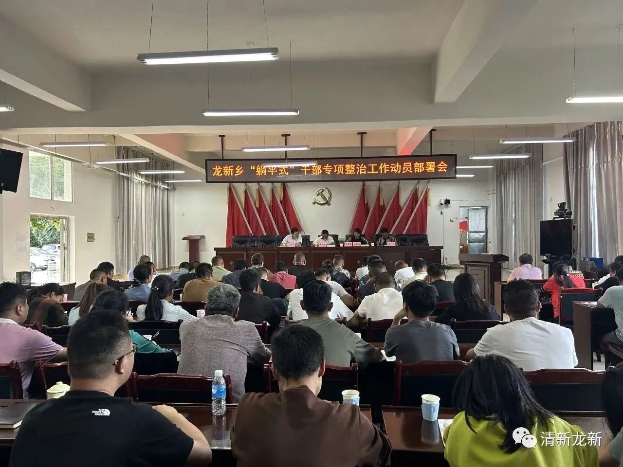 7月25日,龙新乡召开“躺平式”干部专项整治工作动员部署会,乡党政领导班子成员、11个村(社区)党总支书记、全体干部职工共70余人参加会议。