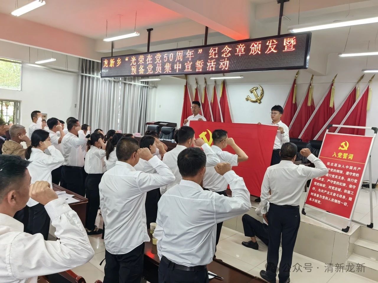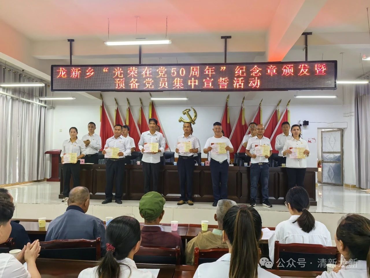 为庆祝中国共产党成立103周年,重温党的光辉历史,激励各级党组织和广大党员弘扬伟大建党精神,传承红色基因,赓续红色血脉。7月1日,龙新乡组织开展“光荣在党50年”纪念章颁发暨预备党员集中宣誓活动,活动共计70余人参加。