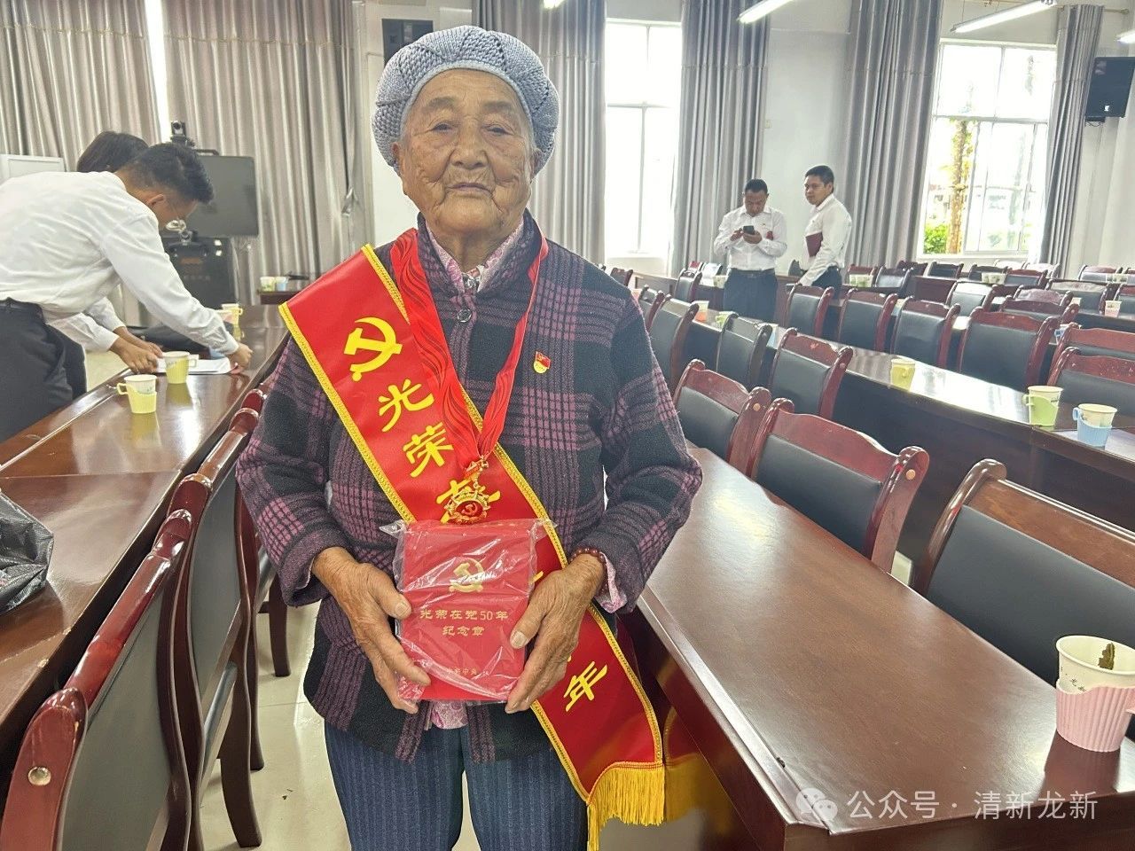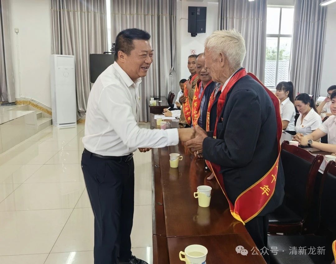 会议为新党员举行了集中入党宣誓仪式,带领老党员重温了入党誓词;为6、7月份入党的与会同志集中过政治生日,并颁发“政治生日”贺卡;同时,乡党委书记为与会的老党员们颁发了“光荣在党50年”纪念章。“我1973年8月加入中国共产党,今天我很自豪能够荣获纪念章,以后我将会继续和发扬老一辈共产党人的光荣传统,坚定理想信念,不忘初心,为龙新事业发展贡献自己的绵薄之力”,87岁老党员尹才春激动地说。